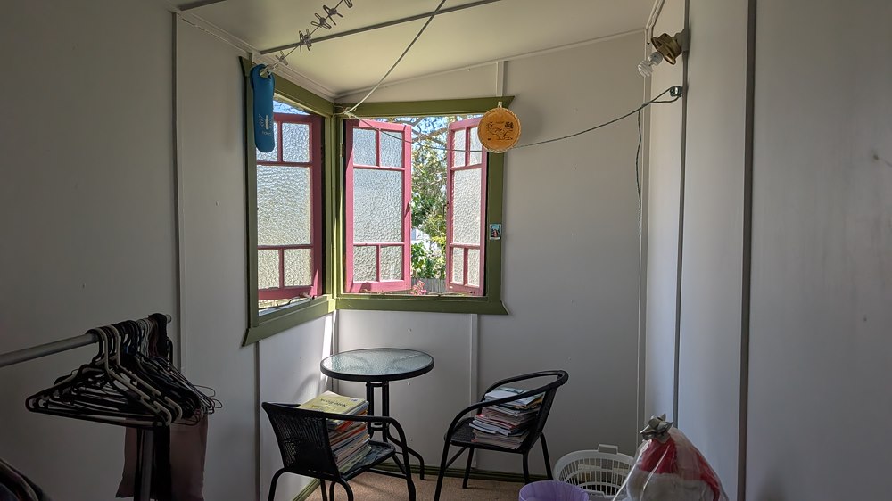I live on a spacious block in a lovely old wooden Queenslander. It's quite cosy, with a spacious living area and kitchen, a shared bathroom and two toilets. One of the bedrooms is a sleepout with a double bed (now rented). The other sleepout has a table and chairs for study (there is also a study area in the playroom outside and a large back yard).